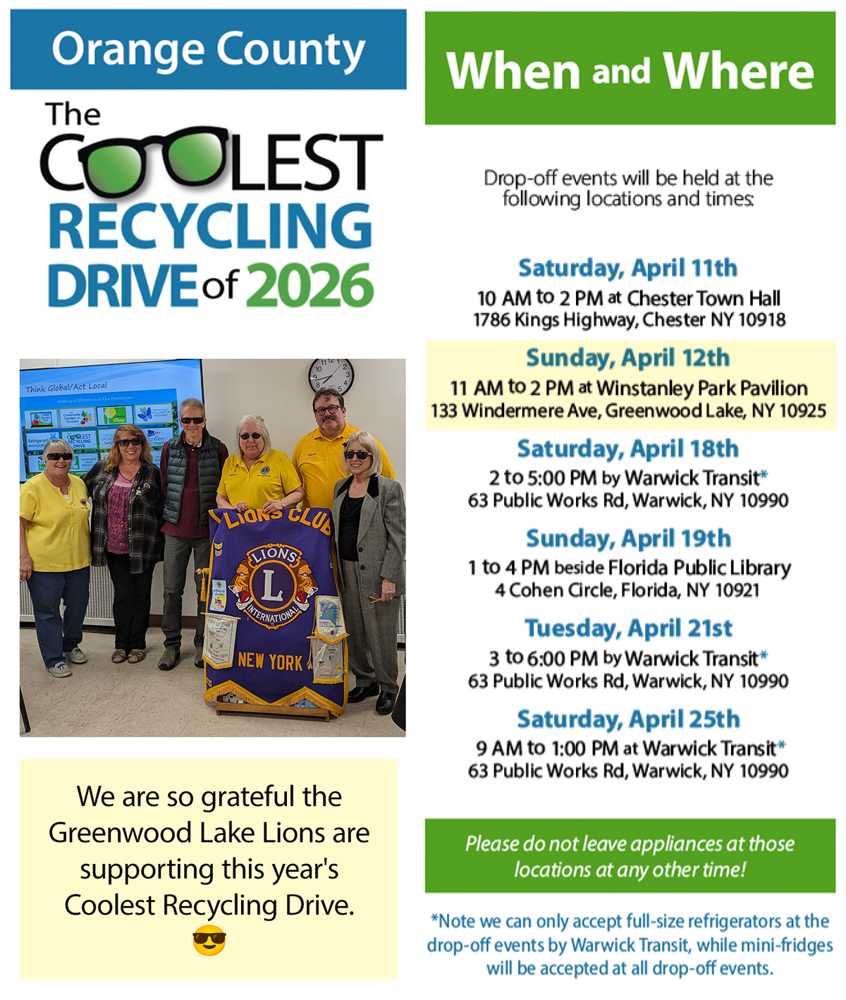 Helping declutter homes while keeping the earth cool! The drive is co-sponsored by the Town of Warwick’s Climate Smart Communities task force and is open to all residents of Orange County.