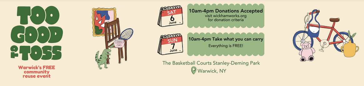 Too Good To Toss - Warwick’s FREE Community Re-use Event! Go to https://www.wickhamworks.org/tgtt-faqs for more information or to volunteer!